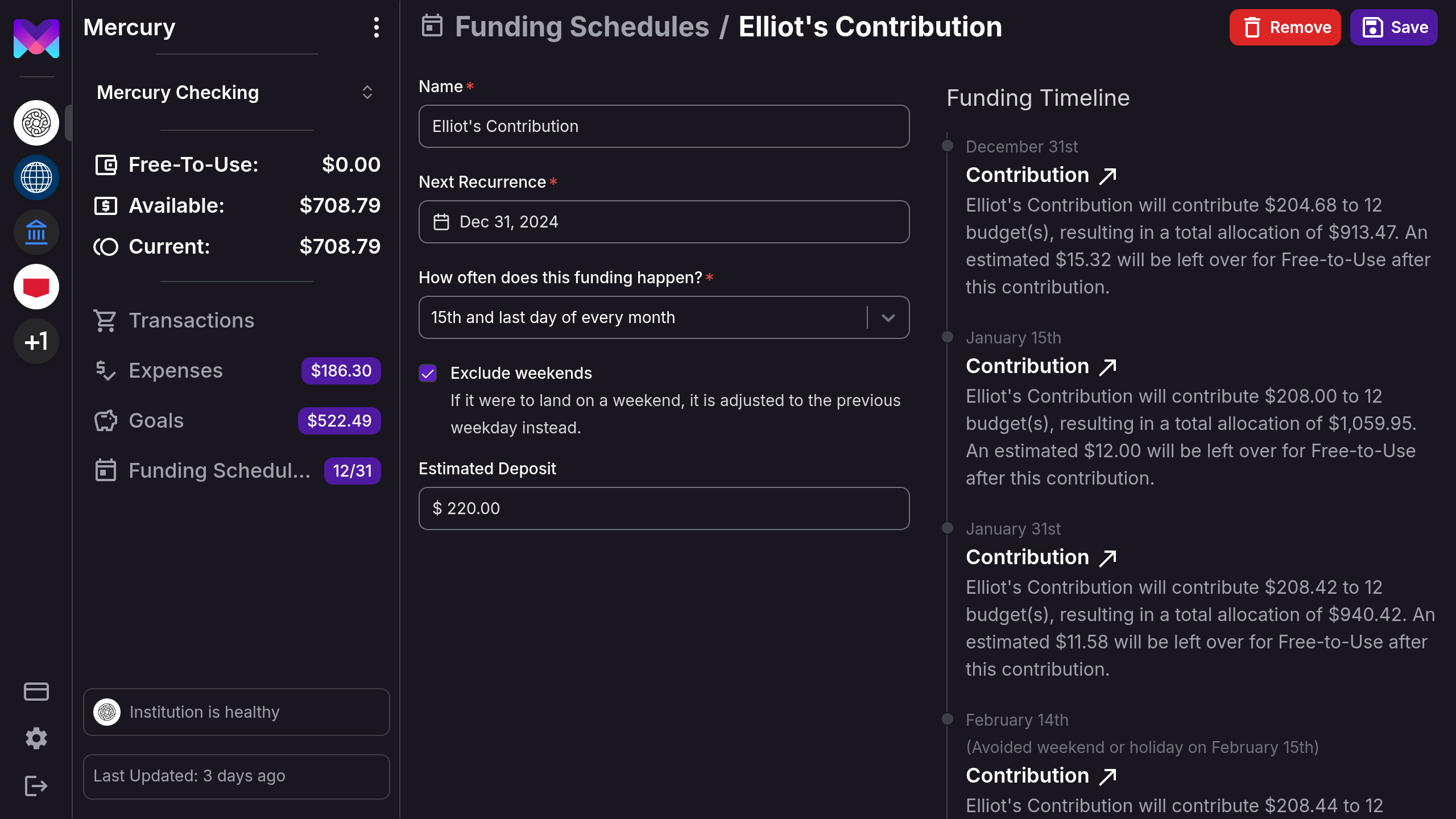 Funding Schedules are monetr's way of keeping track when you get paid, these can be far more flexible if you want them to be. But for now let's just think of them as a way of keeping track of when you're paid. Each time you get paid you want to contribute some amount to your budgeted expenses, but not the entire amount of the expense. Like if your rent is $1200 a month, but your paycheck is $1500; you never want to take $1200 out of your paycheck for a single expense.