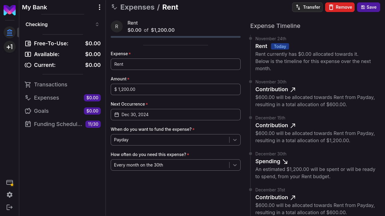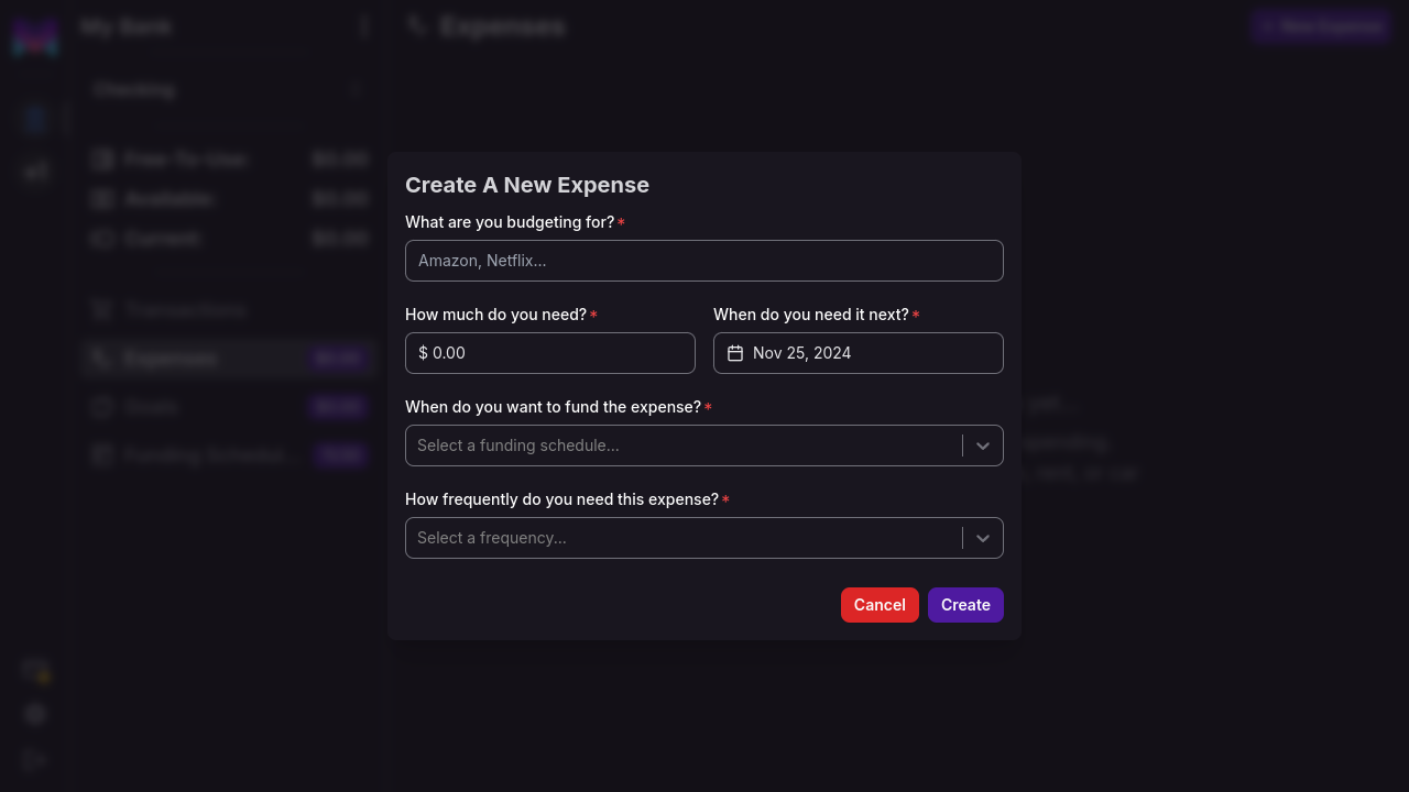 Expenses are how monetr helps you manage recurring financial obligations, such as rent, car payments, or subscriptions. The platform tracks how much money is required for each expense and when it’s due. Using Funding Schedules, monetr automatically sets aside a portion of the expense from each paycheck. This approach ensures that you don’t need to cover the full amount from a single paycheck. As a result, your Free-To-Use funds should remain consistent with every paycheck.