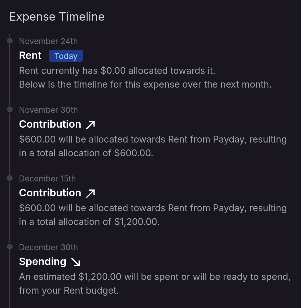 Each expense includes a timeline showing predicted contributions and expected usage. This helps you track when funds will be allocated and when the expense is due.