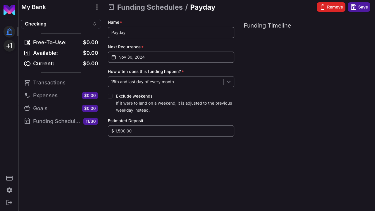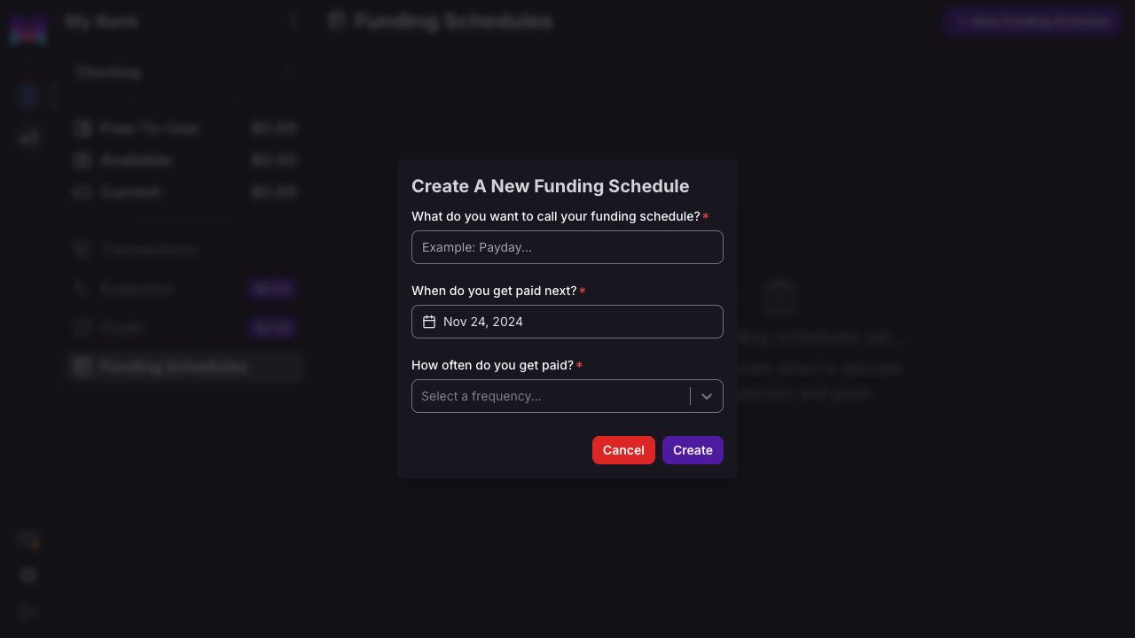 You can create multiple funding schedules if needed, such as putting money aside weekly or only once a month. Every Expense or Goal you create must be tied to a funding schedule.