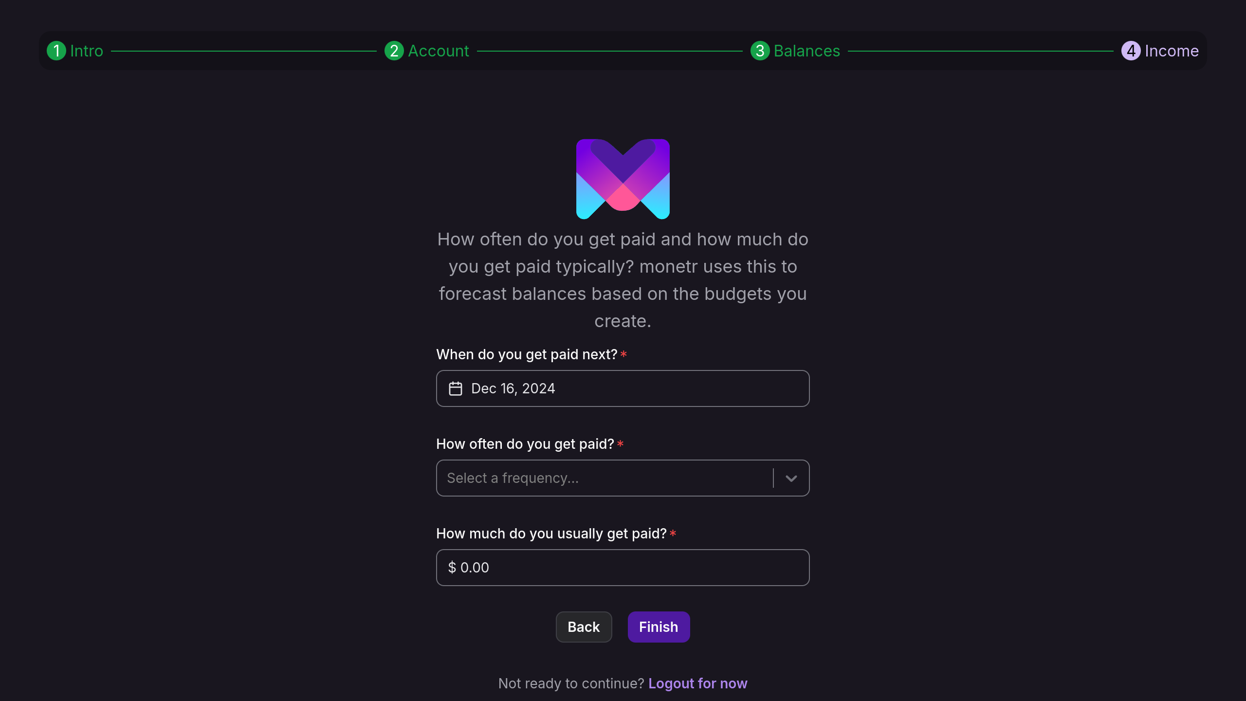 To maximize monetr’s functionality, set up a funding schedule for your manual budget. This determines how frequently funds will be contributed to your budgets. You can modify or delete this later.