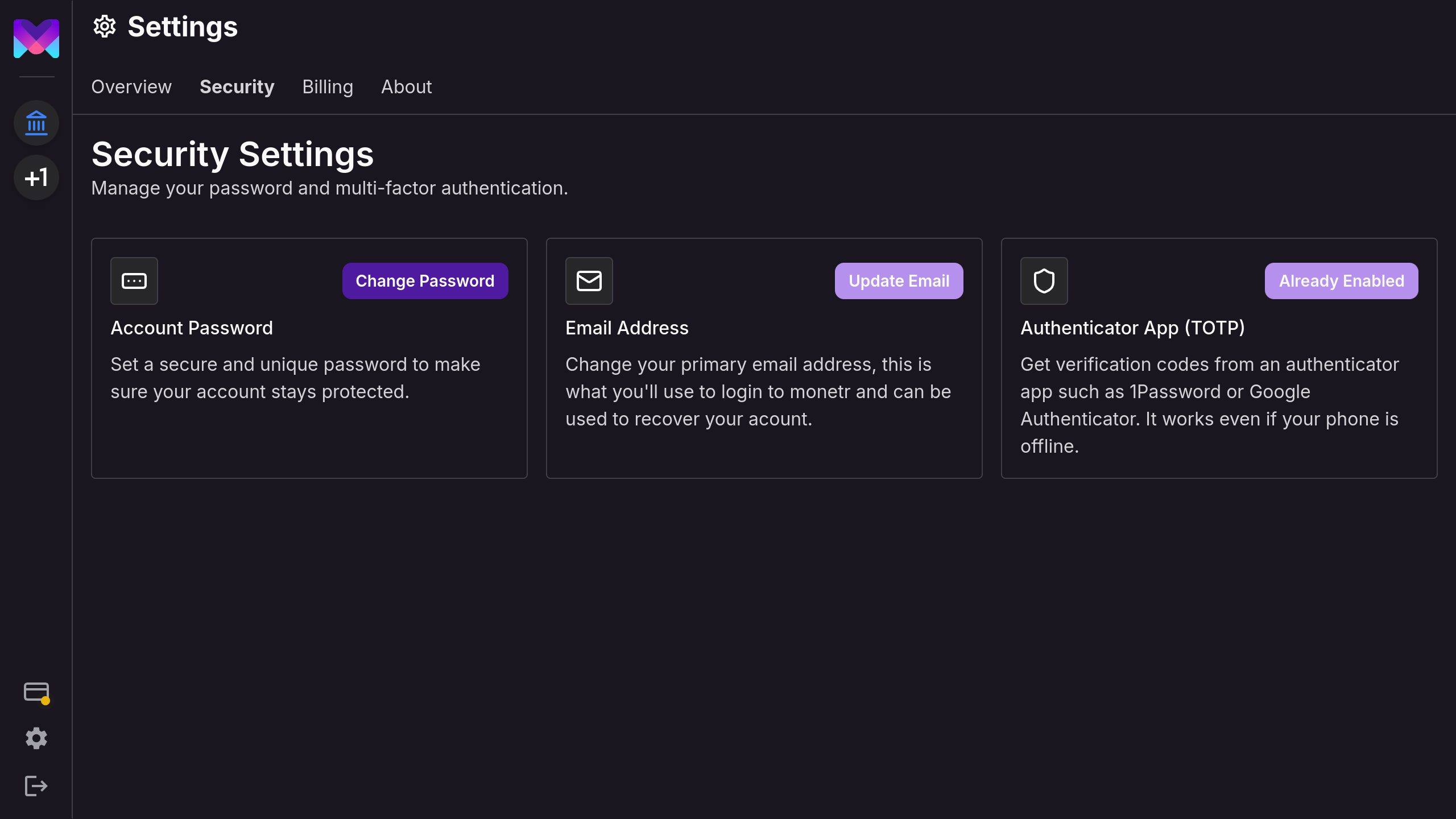 monetr requires users authenticate using an email and a password. A password that is weak or easy to guess makes it easier for unauthorized people to sign in to your account.