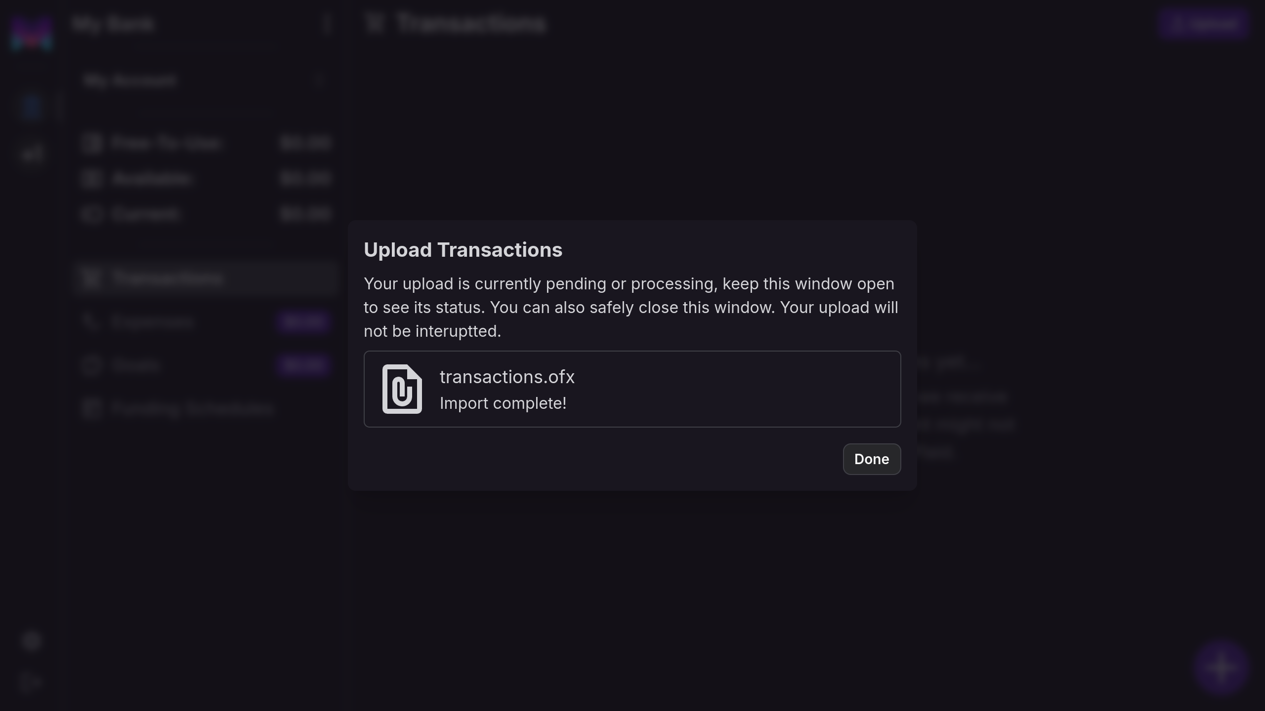 Clicking on Done will close the modal and refresh your view, you should now see the transactions from the file as well as the balance on the sidebar updated.
