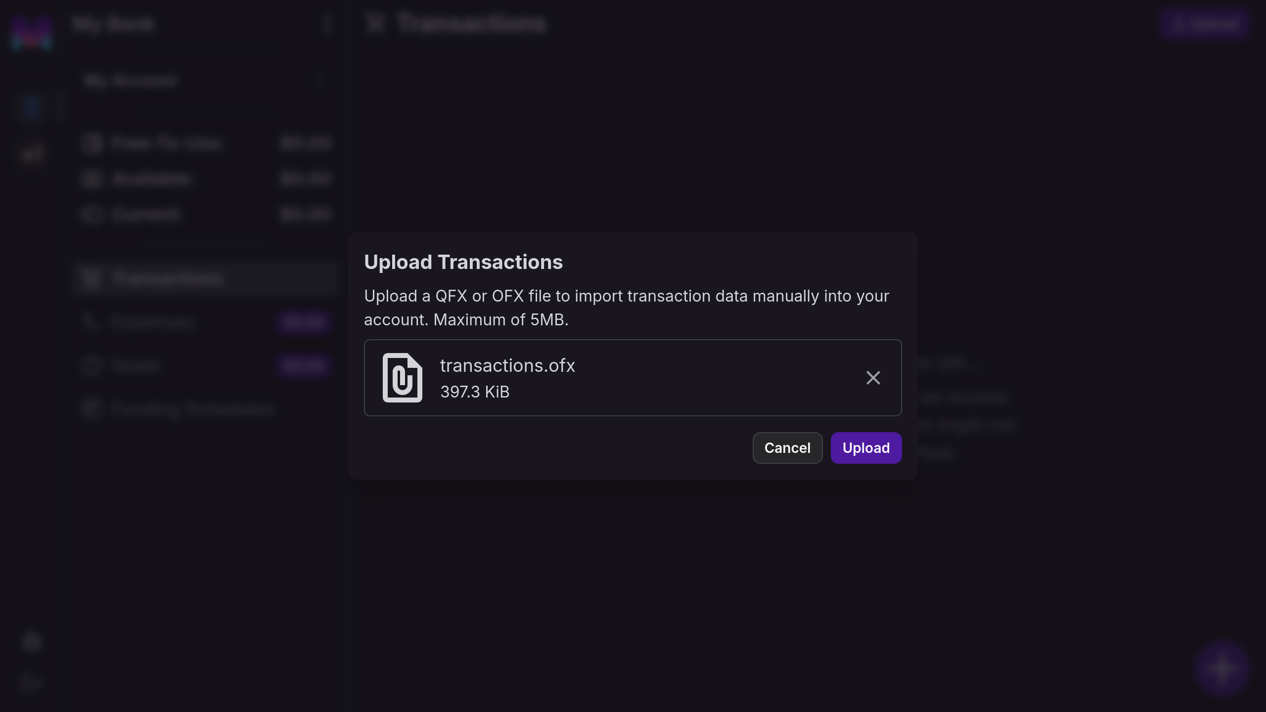 While QFX (Quicken Financial Exchange) files are also accepted, monetr is optimized for OFX files. Some features may not work as expected with QFX files due to differences in formatting.