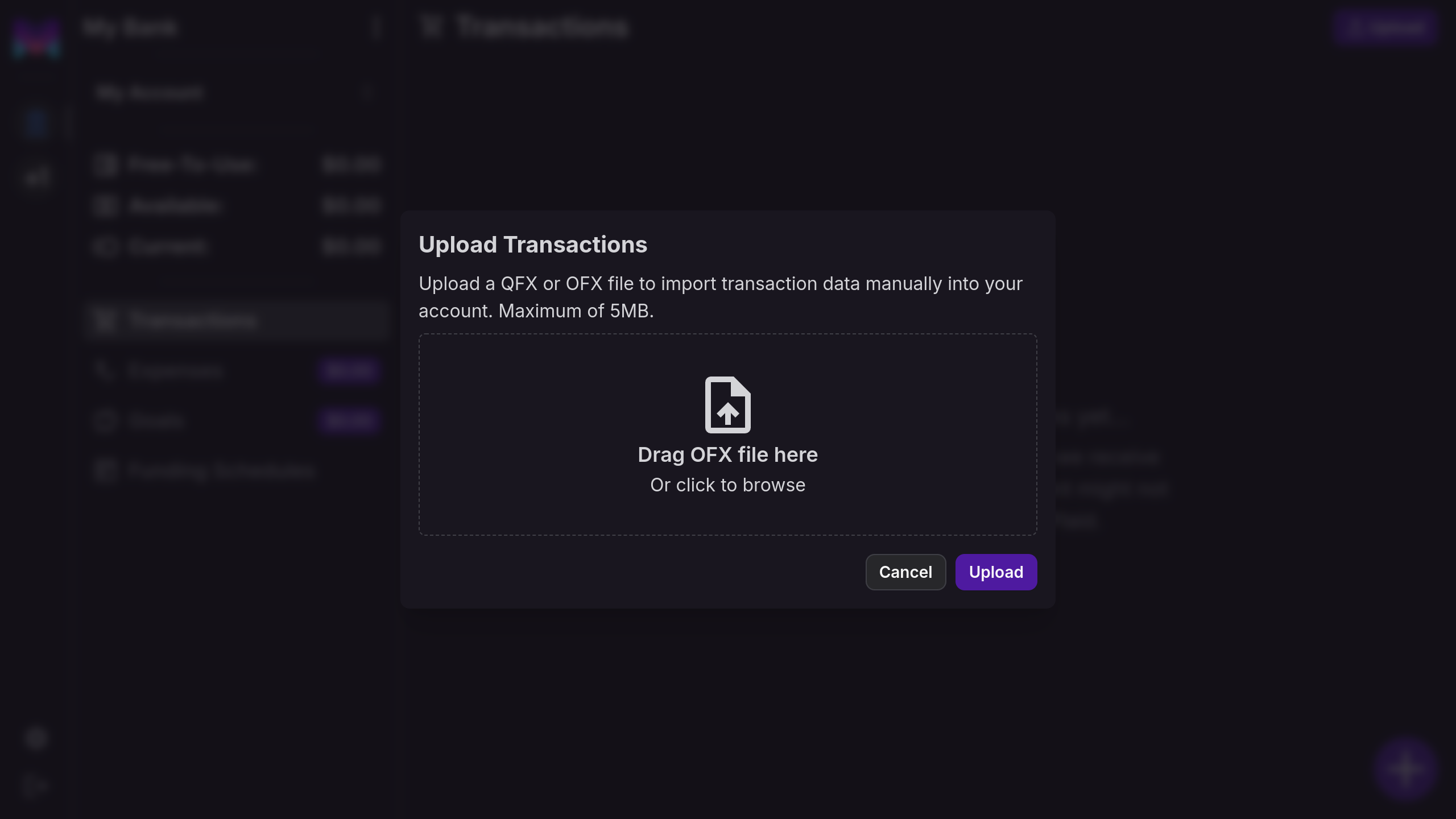 You can click on the file upload area to open a file picker, or you can simply drag a QFX or OFX file into the upload box to continue.